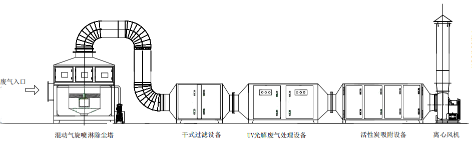 方型氣旋塔應(yīng)用在有機廢氣處理與干式過濾設(shè)備、UV光解除臭設(shè)備、活性炭吸附塔結(jié)合使用,工藝如圖所示:
